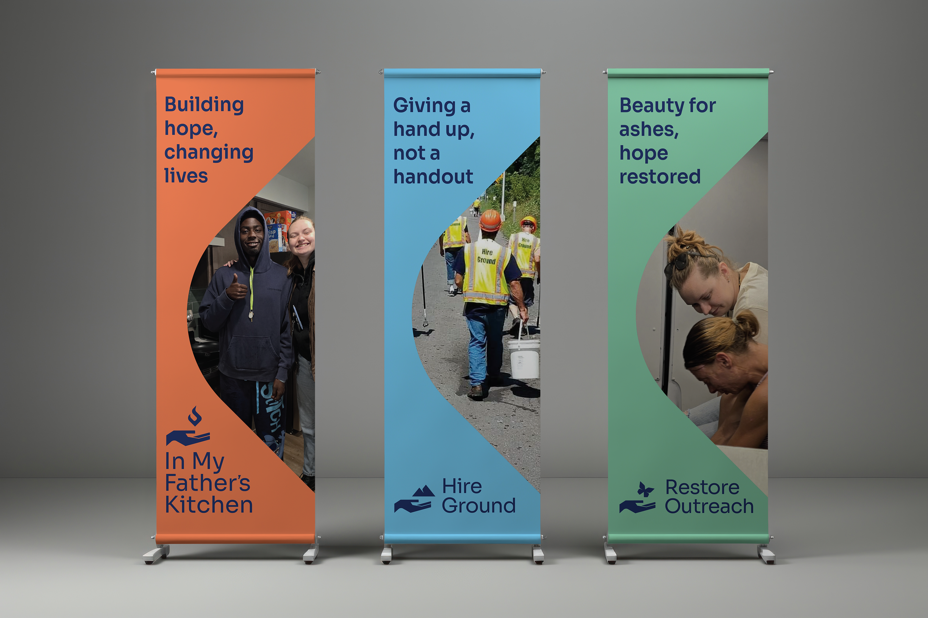 Concept: A series of vertical banners highlighting the services In My Father's Kitchen provides for the chronically homeless in Central New York. Each banner uses a distinct color palette, logo, and imagery representing programs this organization offers.